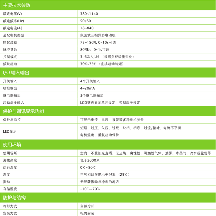 對電網(wǎng)及機(jī)械設(shè)備沖擊小等優(yōu)點(diǎn),是傳統(tǒng)起動方式理想的更新?lián)Q代產(chǎn)品。適用于石油、冶金、礦山、選煤廠含有爆炸性氣體(甲烷)和煤塵的煤礦井下的重載或使用條件惡劣的三相異步電動機(jī)的軟起動、軟停車控制。